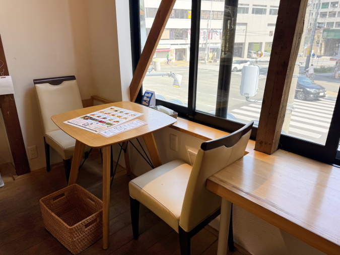 階段を上がった2階がイートインスペースになっていて、テーブル席とカウンター席があります。窓際の席は外光が差し込んで明るい雰囲気。15人以上で貸切も可能です。