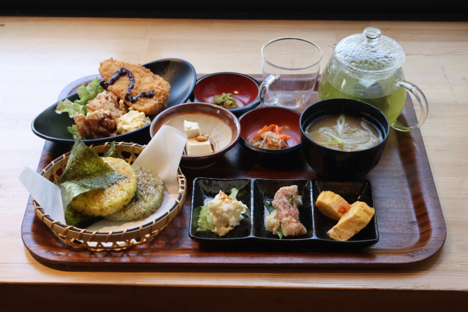 ライスバーガーのバンズと同じもので雑穀入りの「焼きおにぎり」2個に、長崎県産(松浦漁港直送!)のアジフライ、チキン南蛮、明太だし巻き玉子など9種類ものおかず、味噌汁、八女茶までセットになっていて、とにかくボリュームがすごい!