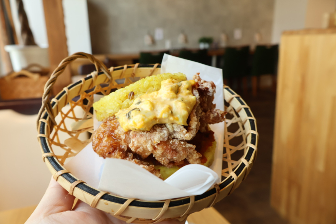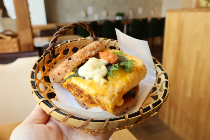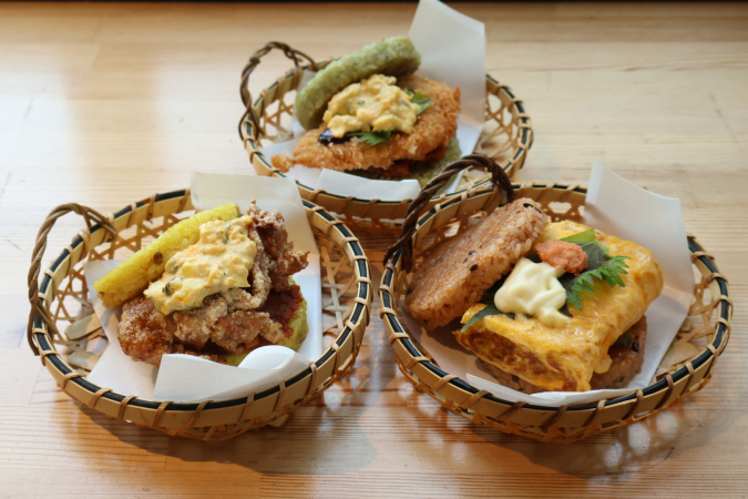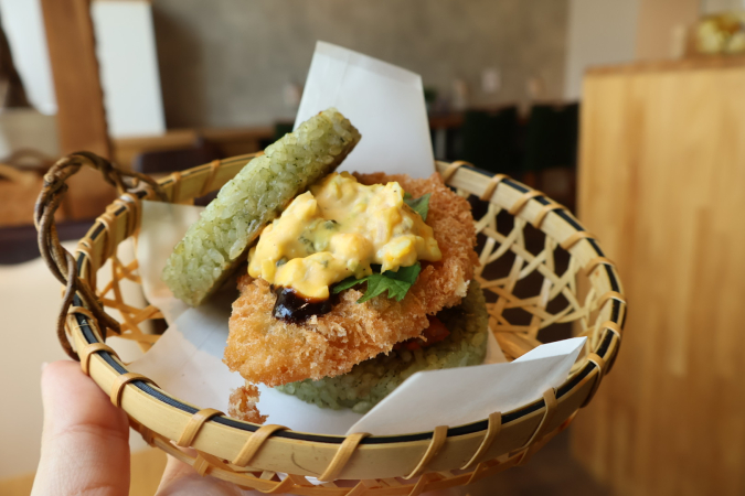 九州産「ひのひかり」と雑穀、野菜パウダーを組み合わせた黄色・緑・赤の3種類のオリジナルバンズが特徴。着色料は不使用で、自然の色合いです。注文してから作ってもらえるので、いつでも出来立てで、外は香ばしく、中はふっくら。お米の甘みが際立ち、具材の旨みを引き立てます。