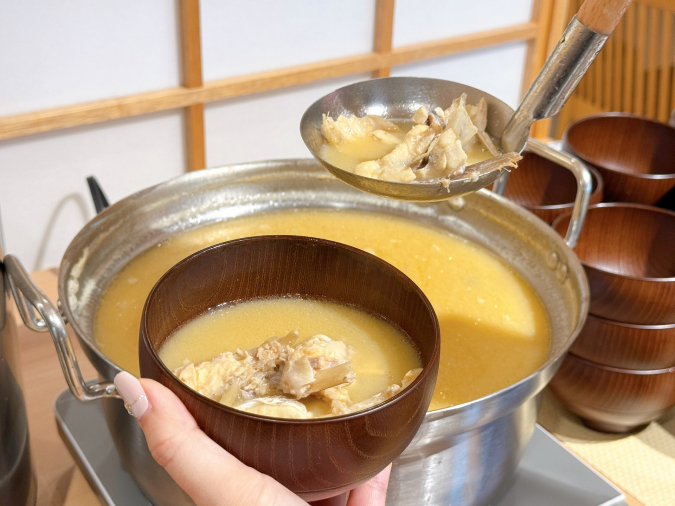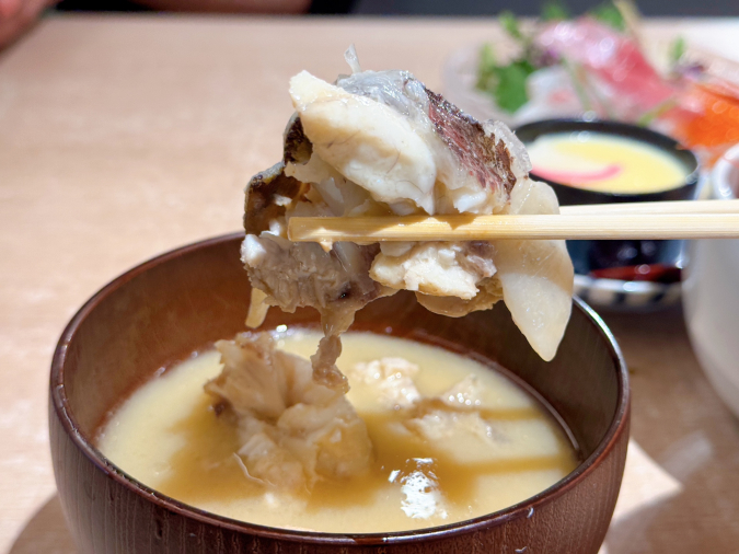 その中でも味噌汁は必食。内容は日替わりですが、この日はゴロゴロと大きな魚のアラが入っていました。