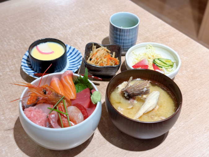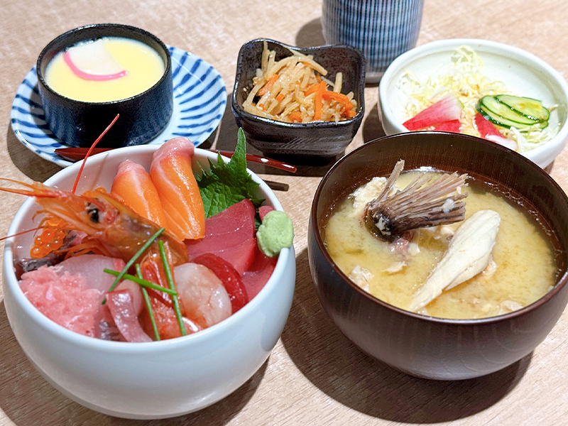 今回いただいたのは、エビがインパクト抜群の『いけだの海鮮丼』(1,738円)。海鮮丼、サラダ、茶碗蒸しに加え、味噌汁とおばんざいの食べ放題が付きます。