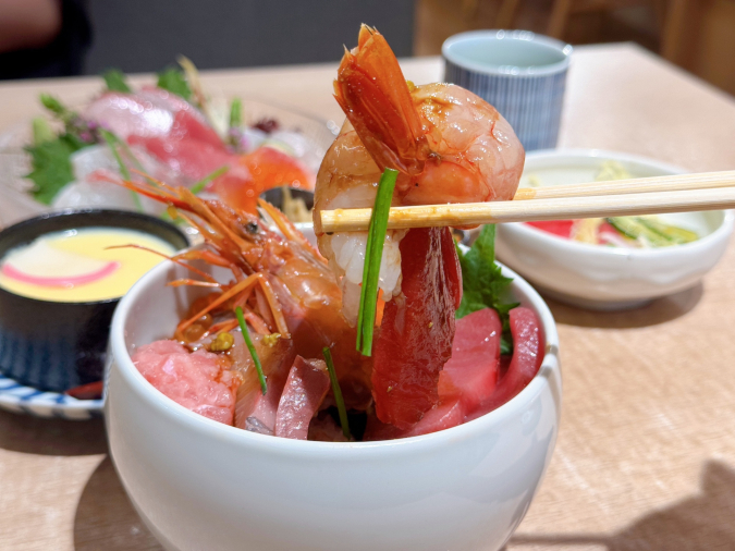 海鮮の内容は日替わり。この日のエビは長浜漁港直送。ぷりっぷりで甘みがあり、旨みがあふれます。マグロ、サーモン、ひらめ、いくらなどものっていて豪華! どれもおいしいです。