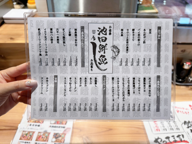 『いけだの海鮮丼』(1,738円)、『ごま鯖定食』(1,518円)、『アジフライ定食』(1,298円)、『鮪・うに・いくら丼』(3,168円)などの定食が楽しめるのも大きな魅力。