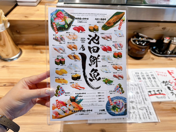 看板メニューのお寿司は、人気メニューの『本まぐろ』(396円)や『うに』(429円)、丸々一本のインパクト抜群な『穴子一本寿司』(768円)など、種類豊富。