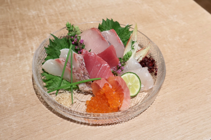 『刺身盛り合わせ』(2,187円)は人気の一品。カンパチに鯛、マグロ、ひらめ、いくら、サーモンといった、『(鮨)池田鮮魚』おすすめの刺身を堪能できますよ(内容は仕入れによって変わります)。