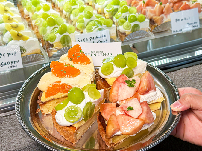 『桃のタルト』(1カット700円)、『シャインマスカットのチーズタルト』(1カット780円)、『博多あまおう苺タルト』(1カット850円)など、季節に応じて旬のフルーツを贅沢に味わえるタルトが楽しめます。