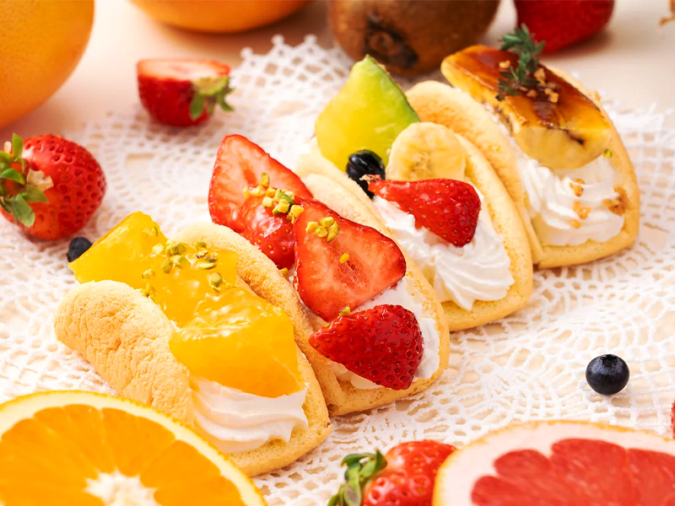 看板商品のワンハンドスイーツ『フルーツオムレット』(1個540円~)には、厳選された旬のフルーツがたっぷり。軽やかな口当たりにこだわったオムレット生地と九州産生クリームが、フルーツ本来のおいしさを引き立てます。