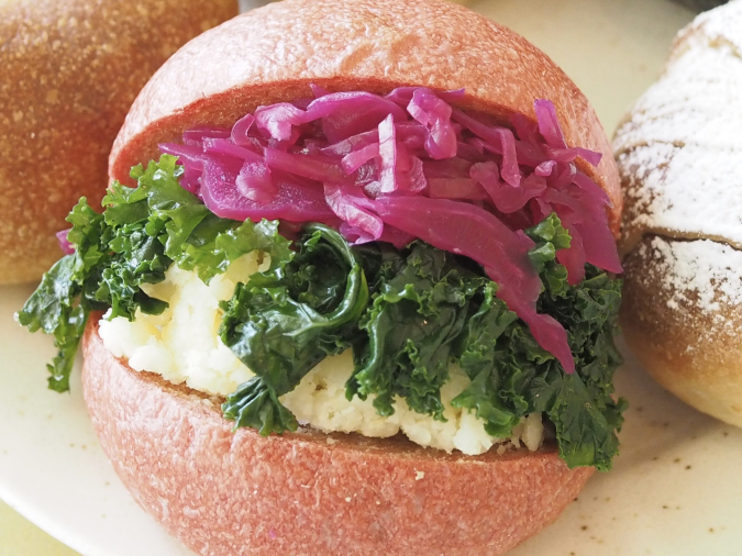 ピンク色がかわいいビーツベーグルに、シャキシャキ食感の紫キャベツのラペ、ケール、マッシュポテトがたっぷり入っています。