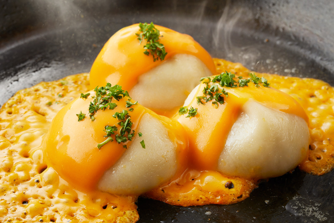 埼玉の餃子専門店『餃子の宮でんでん』のぷるんとした皮が特徴の丸餃子にチーズソースを絡めた『チーズのせ爆汁丸餃子』(写真)は、口の中いっぱいにアツアツ肉汁が溢れ出します。