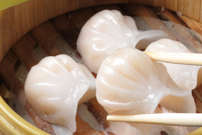 点心師歴30年の腕前で本場の味を楽しませてくれる『香港点心楼』の『プリプリ海老蒸し餃子』(写真)や、