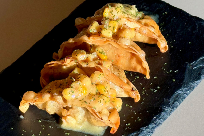 十勝産のとうもろこしを使った『餃子とワイン 果皮と餡』の『バター醤油の揚げトウモロコシ餃子』(写真)は、香ばしいバター醤油にトウモロコシの粒を加えたポップな揚げ餃子。