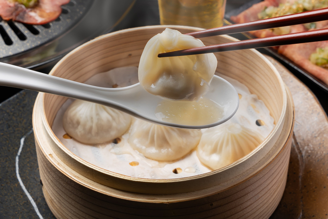 『餃子の宮でんでん』の秩父味噌で羽根にまで味を付けた『小江戸黒豚こく味羽根付き餃子』のほか、変わりダネでは『WORLD DINER』の繊細な薄い皮に包まれた極上スープと牛タンの食感が魅惑的な『黒胡椒の牛タン小籠包』(写真)。