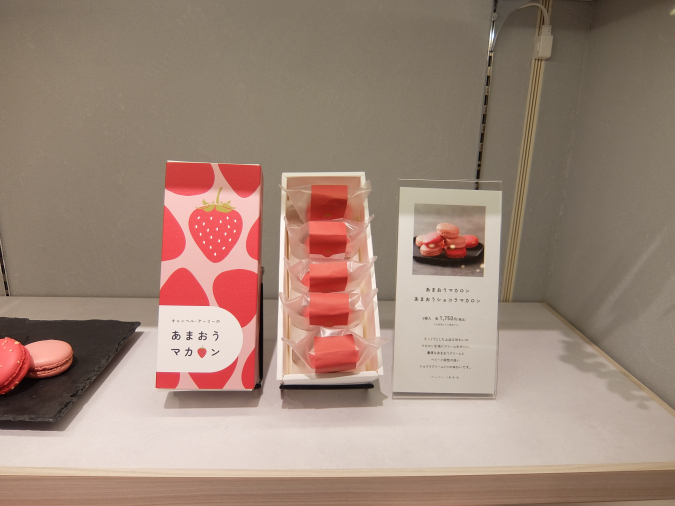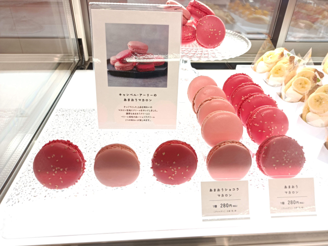 外側のサクッとした歯ざわりのマカロン生地に濃厚なあまおうクリームをサンドした『あまおうマカロン』(1個270円)、ベリーと相性の良いショコラクリームが絶妙な『あまおうショコラマカロン』(1個270円)も。
