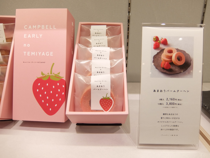 濃厚な「あまおう」の風味をダイレクトに感じられる、しっとりさわやかな味わいの『あまおうバームクーヘン』(1個330円、紙箱5個入り2,160円)。