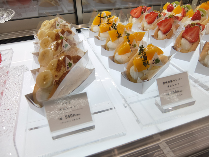 ぷるんとしたマンゴーがのった『宮崎完熟マンゴーオムレット』(1個650円)、輪切りのバナナがかわいい『バナナオムレット』(1個540円)の5種類が販売されていました。