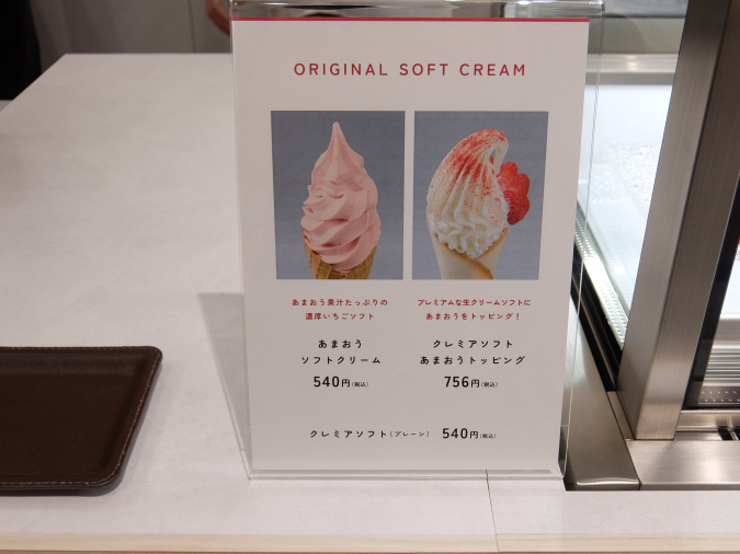 食べ歩きにオススメなのが、オリジナルのソフトクリーム。あまおう果汁たっぷりの『あまおうソフトクリーム』(1個540円)、プレミアムな生クリームソフトにあまおうをトッピングした『クレミアソフトあまおうトッピング』(1個756円)、プレーンの『クレミアソフト』(1個540円)もありますよ。