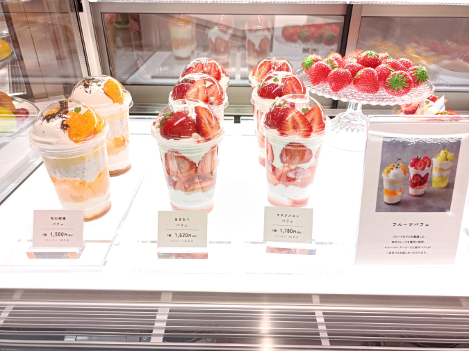 『あまおうパフェ』(1個1,620円)、『マスクメロンパフェ』(1個1,780円)、『旬の柑橘パフェ』(1個1,580円)の3種類が並んでいました。