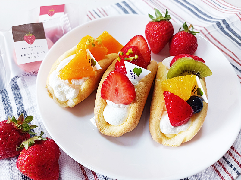 地元福岡の特産いちご『あまおう』を中心に、旬の果物を使ったフルーツオムレットやパフェ、焼菓子が購入できます。