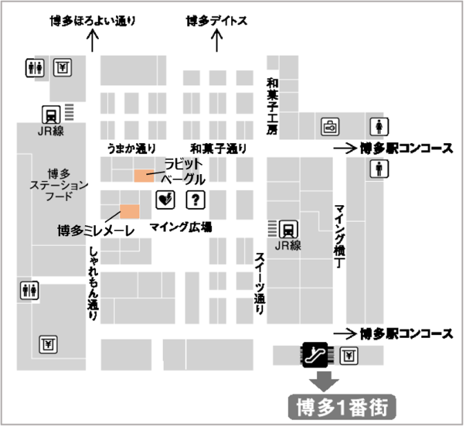 『博多mille mele ミレメーレ』と『RABBIT BAGELS(ラビットベーグル)』が登場するのは、『マイング』食品エリア エキナカキッチン内です。