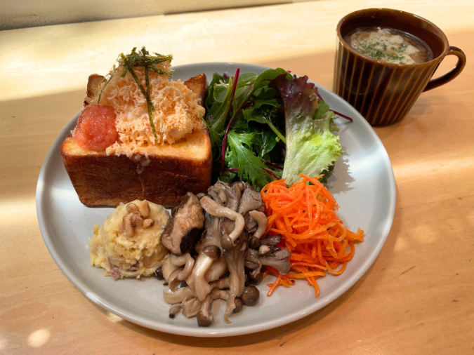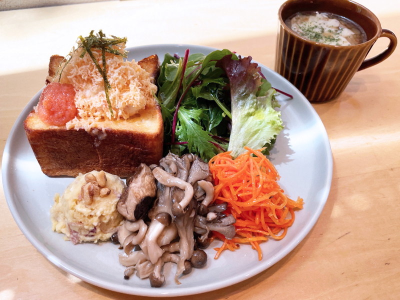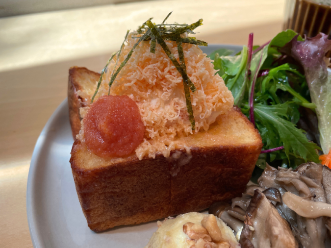 提供される直前に焼かれたキューブ型の名物食パン『ムー』に、たっぷりのった明太子。サイドには3種類のサラダが盛り付けられていて、かなりボリューミーです。