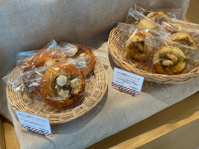 店内の一角には、サンドイッチや総菜パンが販売されています。人気の食パン『ムー』(450円)をはじめ、『エビと野菜のジェノベーゼ』(400円)、『明太子と里芋のフォカッチャ』(350円)など、おいしそうなパンがたくさん。