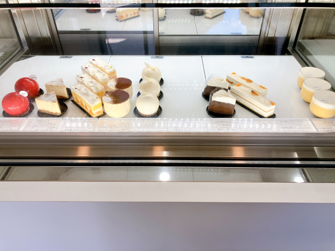 ショーケースにはまるで宝石のような美しいケーキがずらり。定番や季節のケーキなど約10種類あり、どれもおいしそうで迷います。