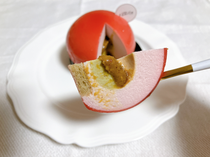 ピスタチオの香ばしさとほろ苦いキャラメル、甘酸っぱいいちごが絶妙にマッチ! 複雑な構造でありながら繊細な味わいで、そのおいしさに感動しました♡