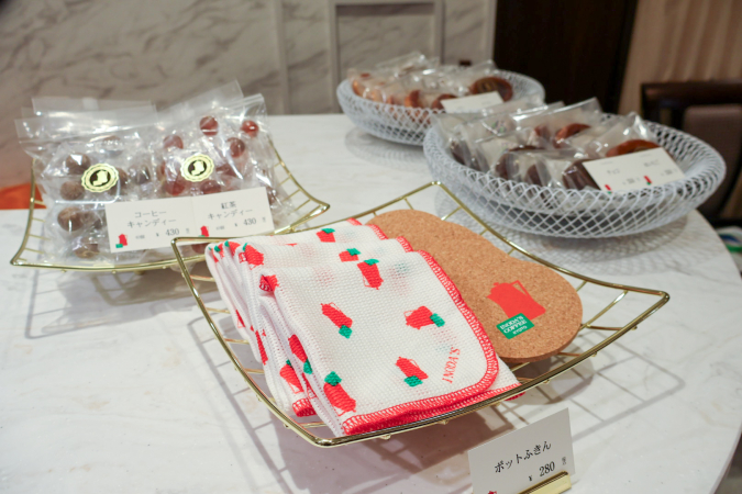店内には『イノダコーヒ』オリジナルグッズが並ぶ物販コーナーも。ロゴ入りのカップ&ソーサーや、ギフト用コーヒーなど、ファン心をくすぐるアイテムが勢ぞろいしています。