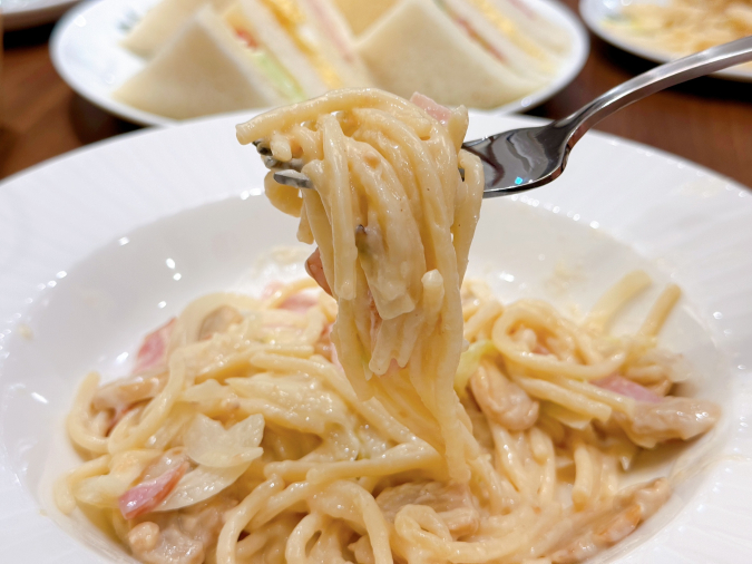 太麺スパゲッティに濃厚ホワイトソースをたっぷり絡めた『ボルセナ(ホワイトソース)』(1,130円)もオススメ。ベーコン、たまねぎ、マッシュルームなど具材たっぷりで、大満足間違いなしです。