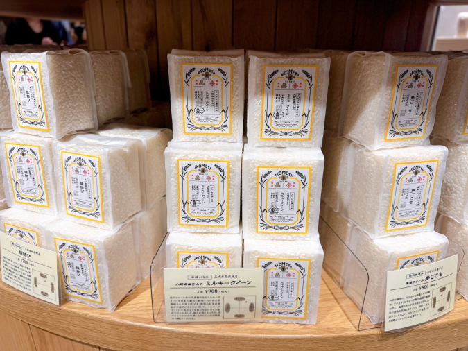 写真のかわいい四角の真空パックは、2合分が入っています(700円~1300円)。いろんなお米を試してみたくなりますね! ちょっとしたプレゼントにも重宝しそう。