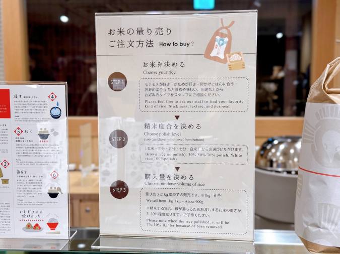 お米の量り売りは1kg(6合)単位で購入することが可能。10種類以上の中から選べるので、まずは少量ずつ購入してもよさそうですね。おすすめの精米度合いは五分と七分なのだそう!