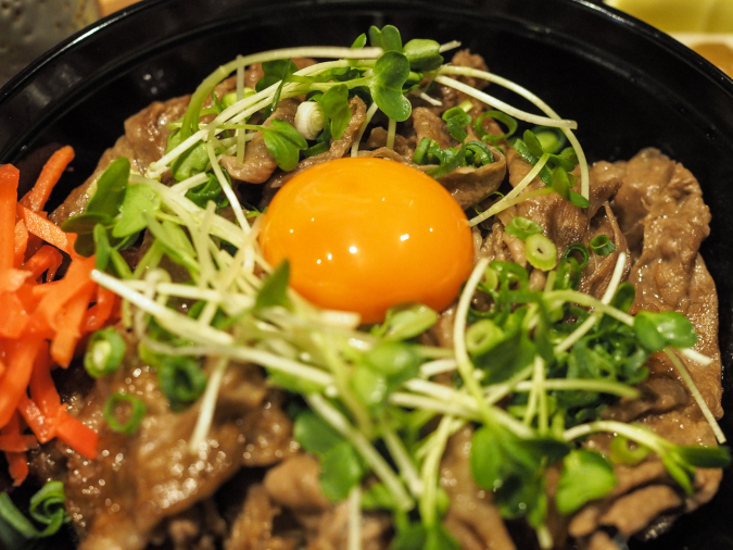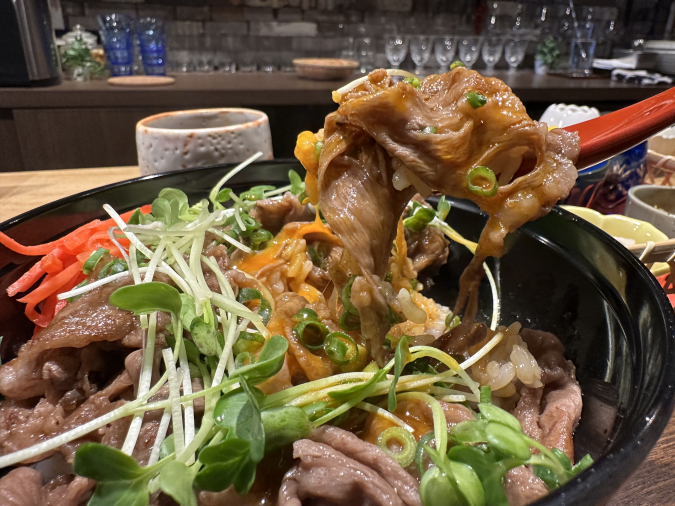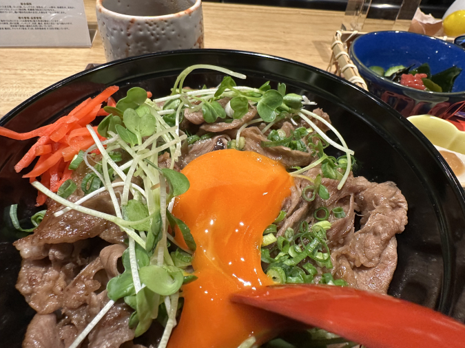 とろりとした黄身を和牛丼の上に落とせば、ビジュアルも味もワンランクアップしました。