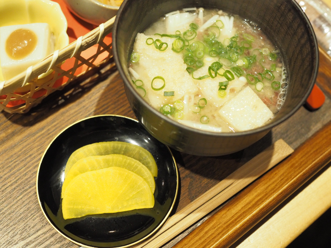 御膳には、手作りの小鉢4種といりこ出汁の味噌汁、お漬物がついてきます。