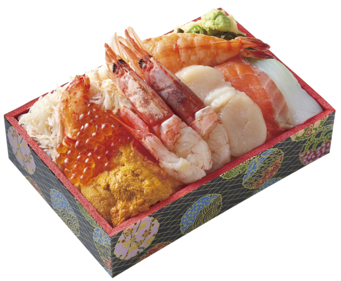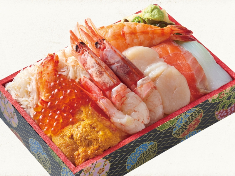 海老、ホタテ、うに、いくら、イカ、サーモンなどがたっぷり! まさに“海のお宝”が詰まった、豪華なお弁当です。