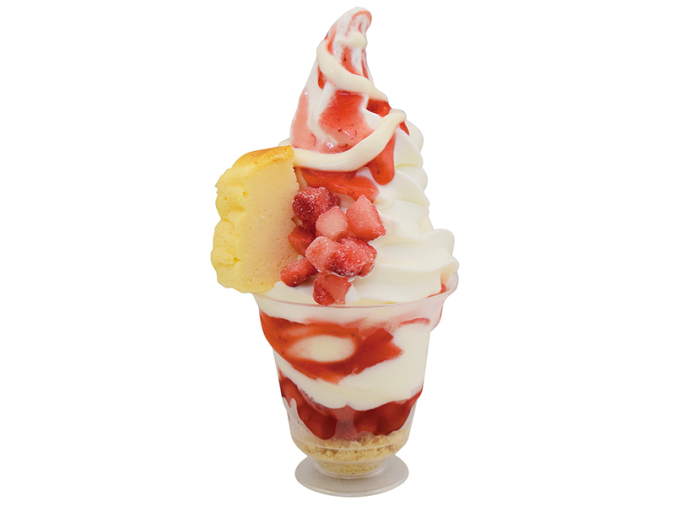 『のびーるストロベリーパフェ』は、新鮮なミルクの濃厚ソフトクリームに、果肉入り苺ソースやチーズケーキを飾り、中にはのびるチーズをいれた一品。甘さの中に塩味を効かせ、旨さが引き立ちます!