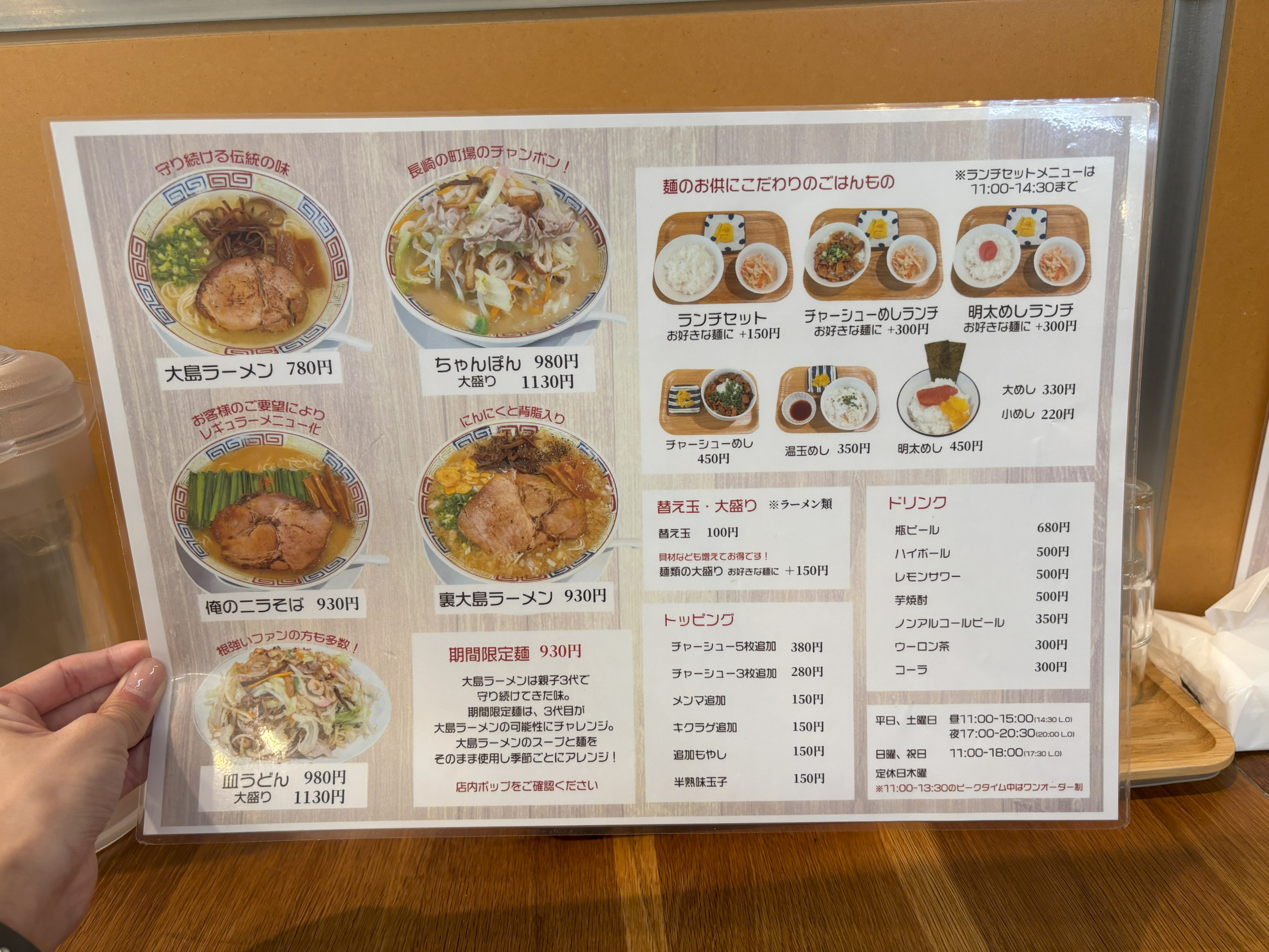 3代目店主が本店から継承した伝統の味『大島ラーメン』(780円)や『ちゃんぽん』(980円)の定番メニューに加え、期間限定麺が不定期で登場します。