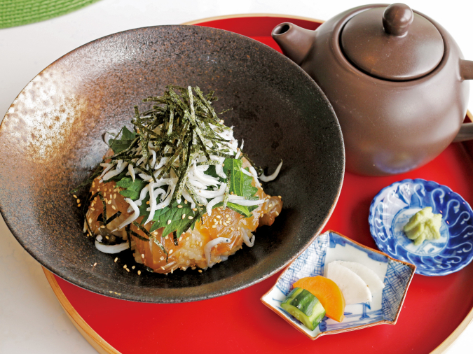 特製の味噌ごはんに自家製タレに漬け込んだ真鯛と生しらすをのせ、自家製の鯛出汁をかけて食べる絶品鯛茶づけが提供されます。