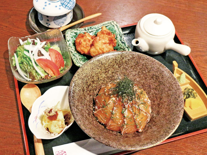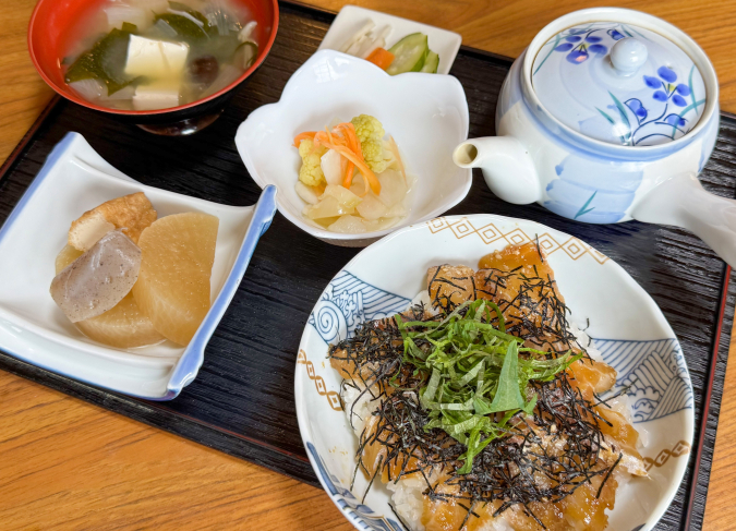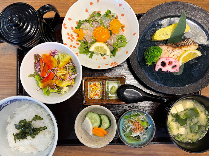和食歴42年のオーナーシェフがお米と出汁等、素材にこだわって提供。単品は小鉢、漬物、茶づけ出汁付きで、プラスでサラダと出汁巻きと鯛の若狭焼きが付いたセットも用意されています。