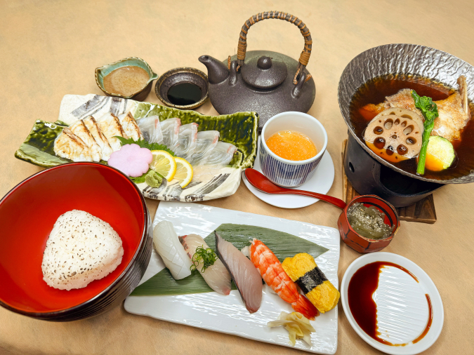 お刺身としても味わえる、炙りと生の2種の鯛を名物オランダ煮と共に。自慢の寿司もついています。