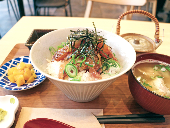 ゴマダレに3時間程漬け込んだ鯛をご飯の上に。小鉢と鯛のお吸い物が付きます。
