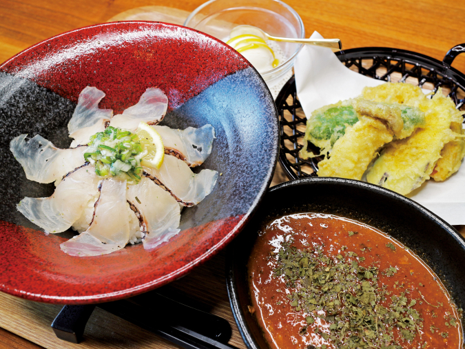 天然真鯛を灸りにし、福津産のトマトで作った出汁でいただく洋風の鯛茶づけ。自家製真鯛オイルやチーズで味の変化を楽しめます。