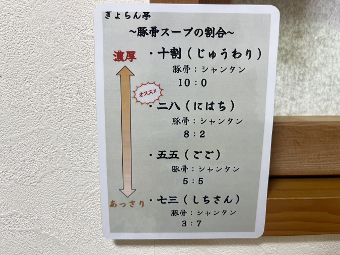 豚骨とシャンタンを合わせる割合は、10:0の濃厚な『十割』から、8:2の『二八』、5:5の『五五』、3:7のあっさり『七三』までバリエーション豊富。どのスープを頼んでも、ラーメンの値段は変わりません。