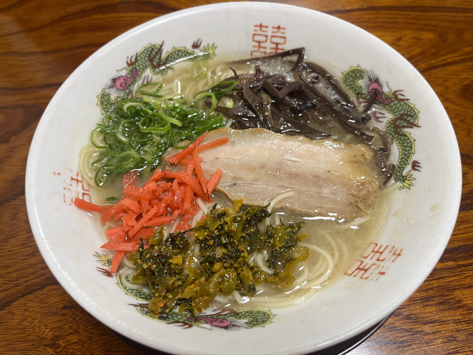 卓上に置いてある無料のトッピング(定番の紅しょうが、辛子高菜)を加えるとこんな感じ。
