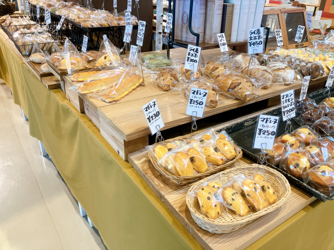 食パン、ベーグル、総菜パン、季節限定パンなど、おいしそうなパンがずらり。