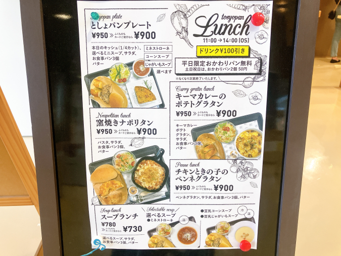 パンだけでなく、11:00~14:00(L.O.)に楽しめるランチセットも人気! 選べるスープとパンがセットになった『スープランチ』(780円)や、本日のキッシュ・ミニスープ・サラダ・パン3個・バターがセットになった『としょパンプレート』(950円)など、5種類が楽しめます。