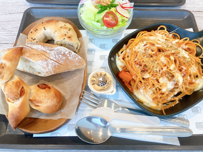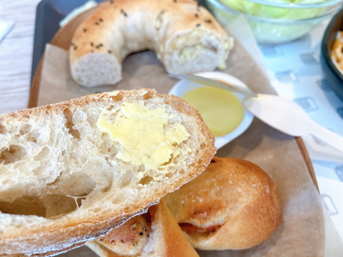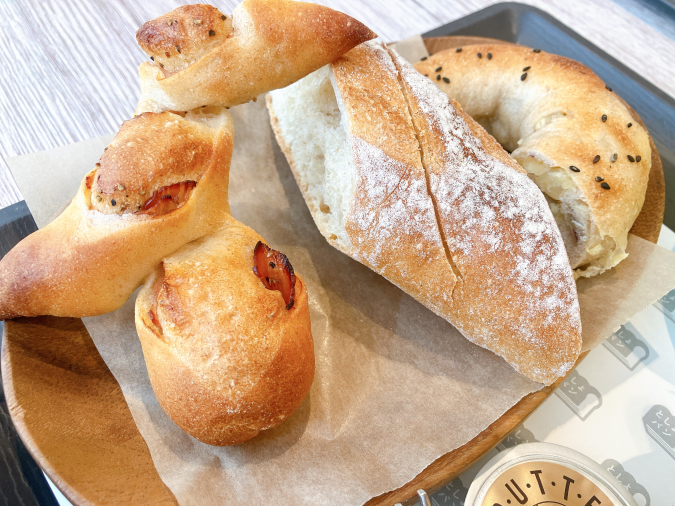 パンはランダムで、どの種類が出てくるかはお楽しみ♪ この日は『ベーグルさつま芋』『バゲット』『ベーコンエピ』の3種類でした。