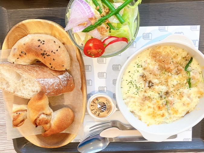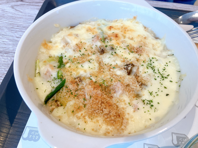 アツアツのグラタンにはチキンやきの子がゴロっと入っていて、やさしい味わい。パンとの相性もバッチリでした。