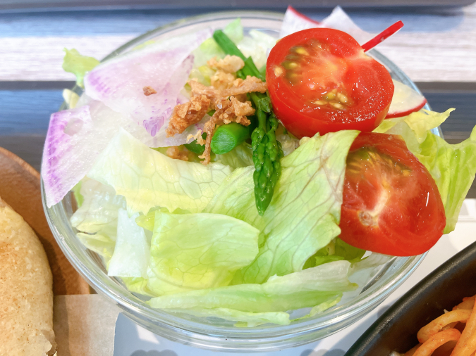 自家農園で育てたレタスやミニトマト、アスパラなどが入ったサラダは、どれも新鮮でシャキシャキ!