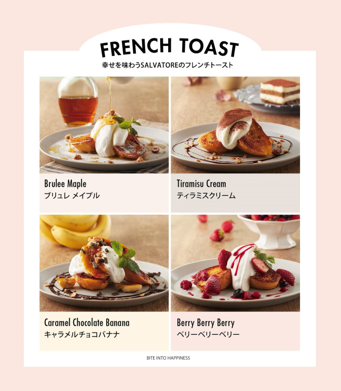 フレンチトーストに相性の良いチョコソースとキャラメリゼしたバナナがベストマッチの『キャラメルチョコバナナ』(1,210円)、たっぷりの生クリームにイチゴやベリーなどで見た目もキレイな『ベリーベリーベリー』(1,408円)も食後やカフェタイムにおすすめです。