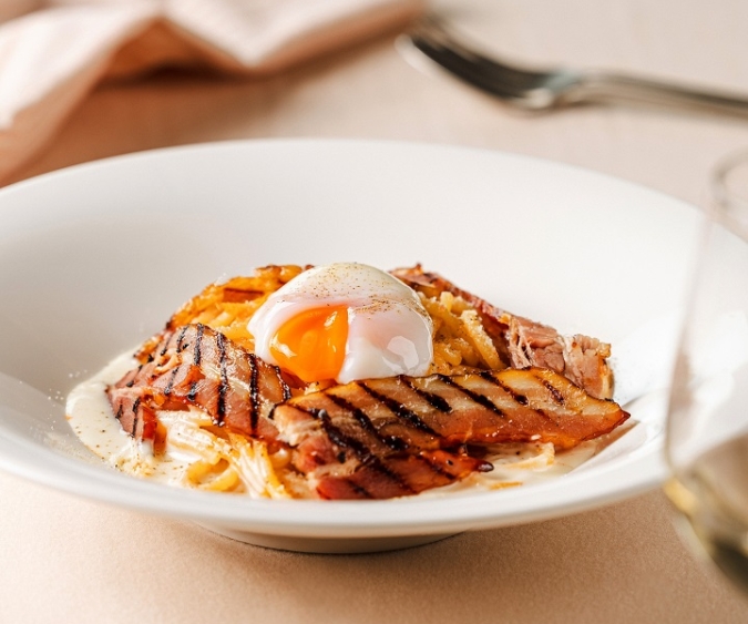 リッチなカルボナーラに明太子が相性ぴったりの『グリルベーコンの明太子カルボナーラ』(1,760円)。グリルベーコンの香ばしさがアクセントに。